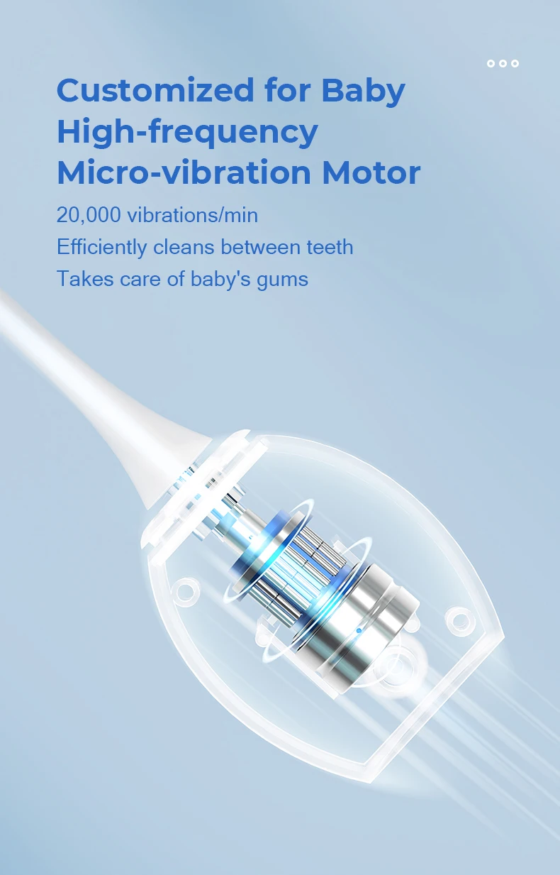 Brush Head Customized Brush HeadsVarious Brush Heads for Baby 10,000 bristle brush head+round/square bristle brush headToothbrush head specially designed for babies Smile High Frequency Motor Customized for BabyHigh-frequencyMicro-vibration Motor 20,000 vibrations/min Efficiently cleans between teethTakes care of baby’s gums
